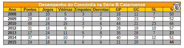 O Galo do Oeste teve a segunda pior participação em sua história disputando a Segundona, a pior campanha foi a de 2012 quando o clube fez 17 pontos em 24 partidas, tendo um aproveitamento de 23%. A campanha de 2015 teve um aproveitamento de 44%, foram 24 pontos em 17 jogos. O Concórdia disputou por sete vezes a Segundona Catarinense (2008, 2009, 2010, 2012, 2013, 2014 e 2015).