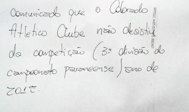 Colorado Atlético Clube filed, on Monday (14), at the Paraná Football Federation (FPF), a document stating that the team did not give up the 2015 Paranaense Third Division Championship. The team's director, Émerson de Lima Moraes, stated in a special interview for the Newsroom in the Field that, "despite the financial difficulties that the teams of ...